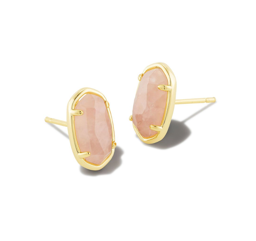 A polished pair of studs in our signature shape. The Grayson Gold Stud Earrings are sophisticated and unique, featuring our iconic silhouette inlaid with a genuine Rose Quartz stone A soft, blushing hue courtesy of the microscopic inclusions within, this genuine and undyed stone inspires love, healing, and nurturing.