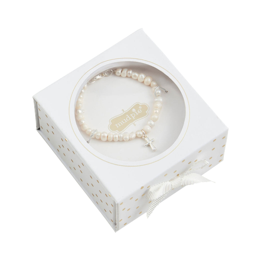 - Mud Pie children's pearl bracelet with silver metal cross charm.
