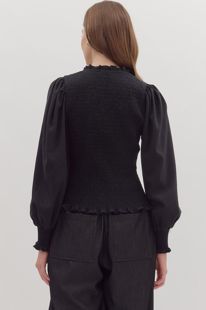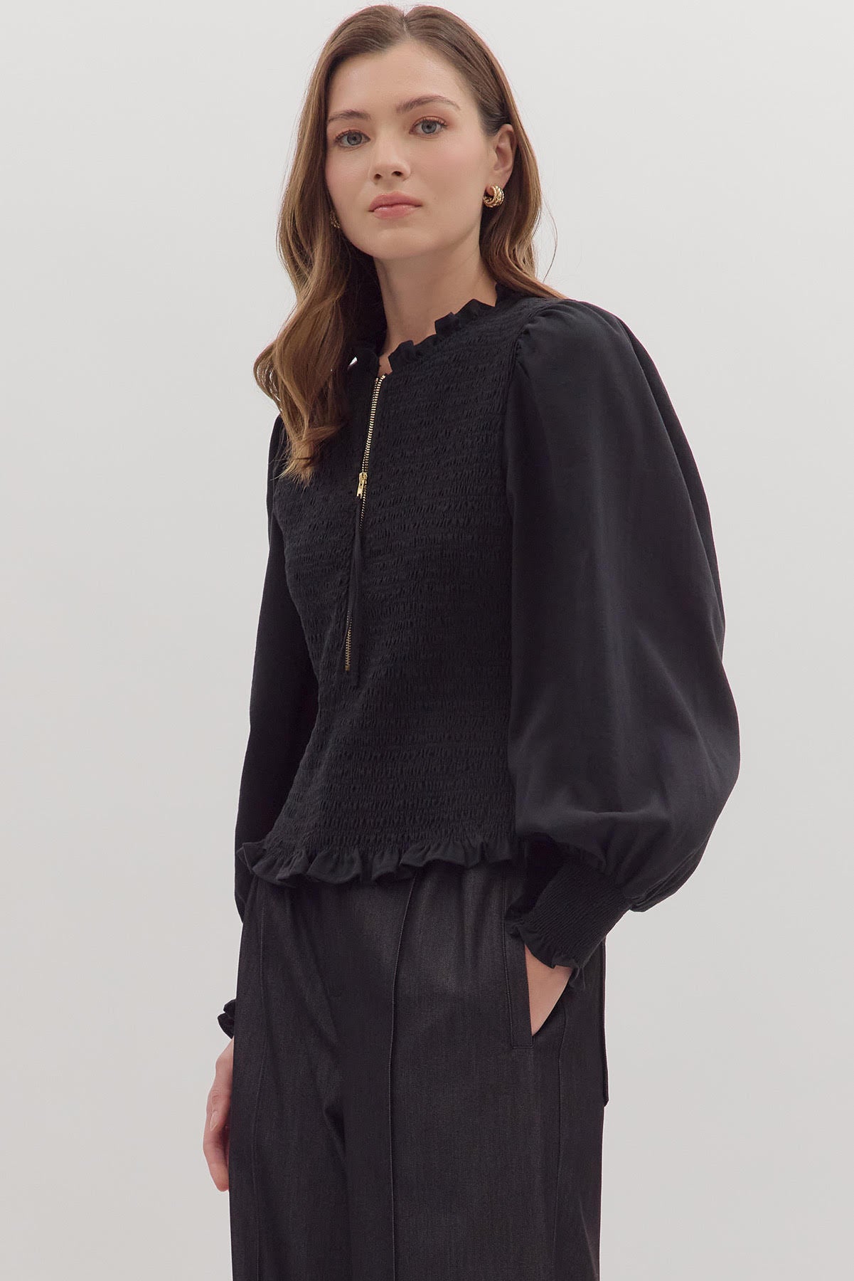 Solid long puff sleeve top featuring smocked bodice and gold half-zip closure at front. Unlined. Woven. Non-sheer. Lightweight.