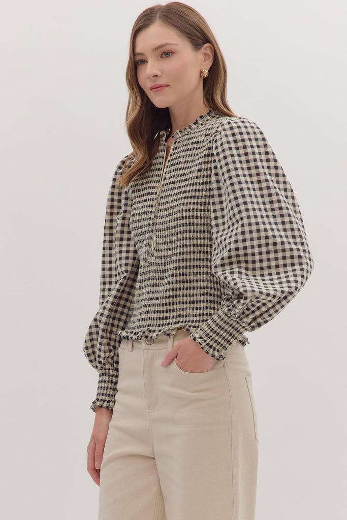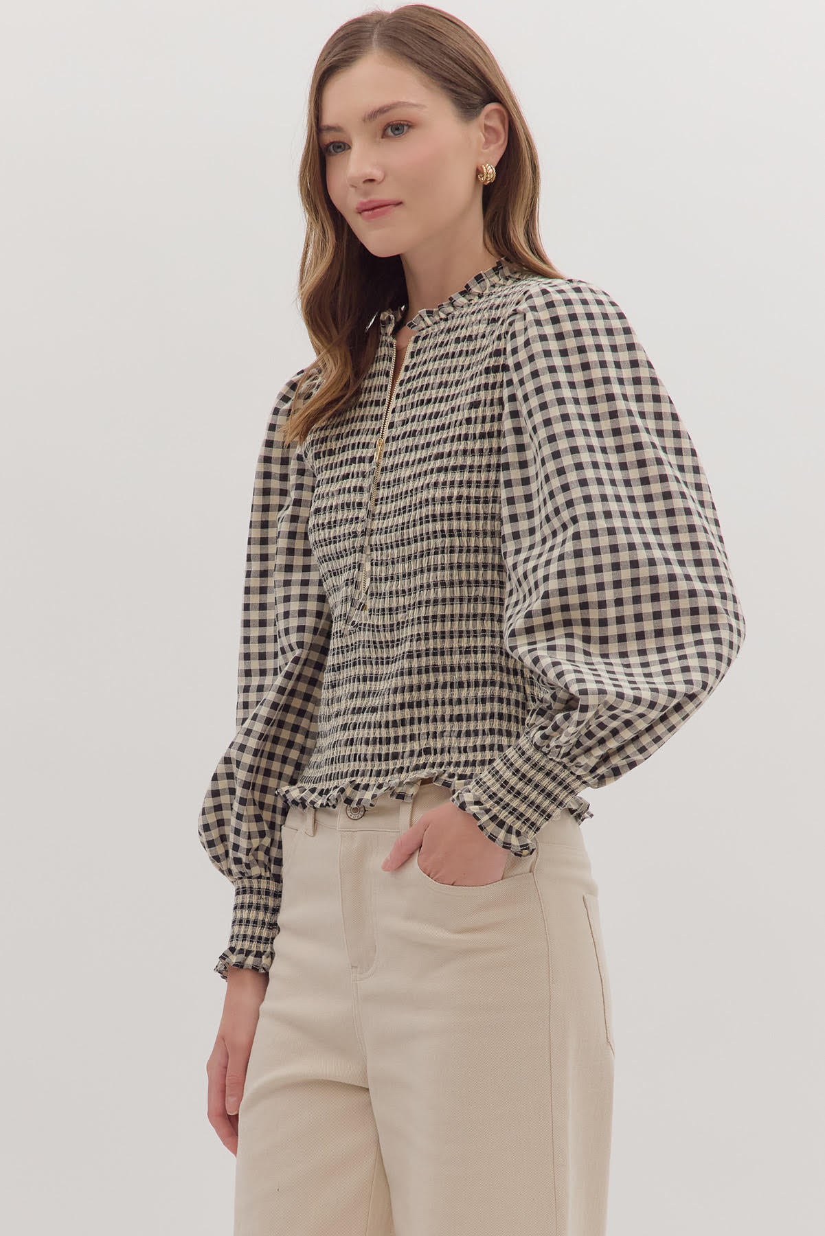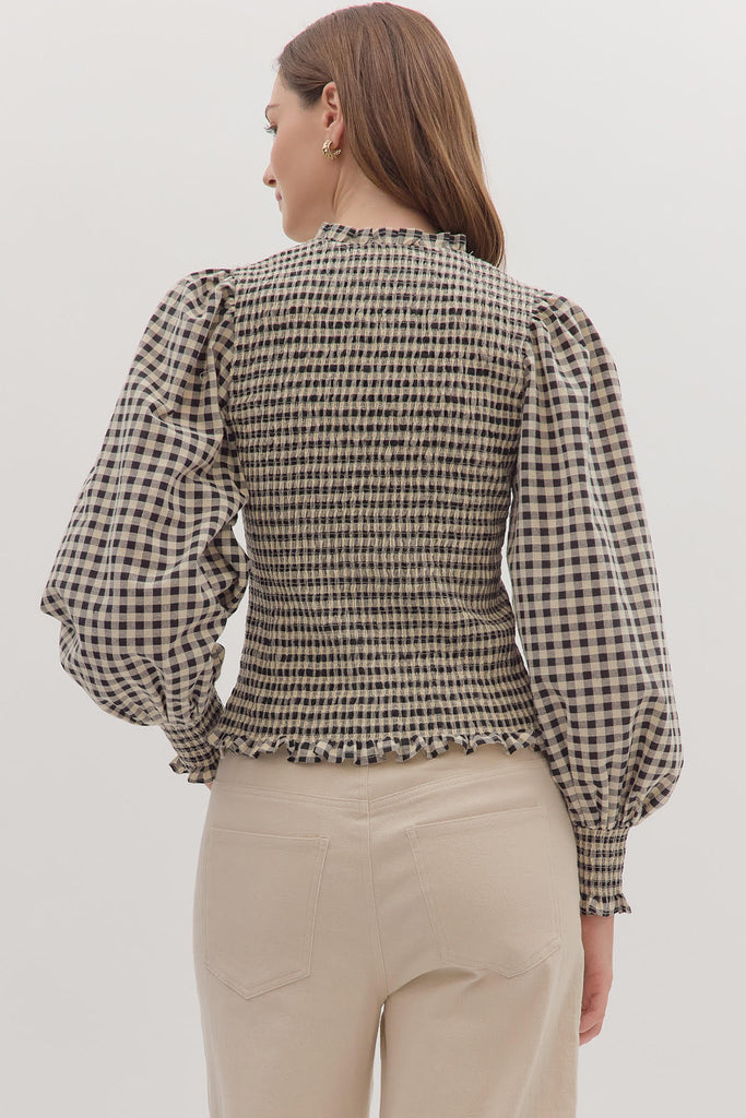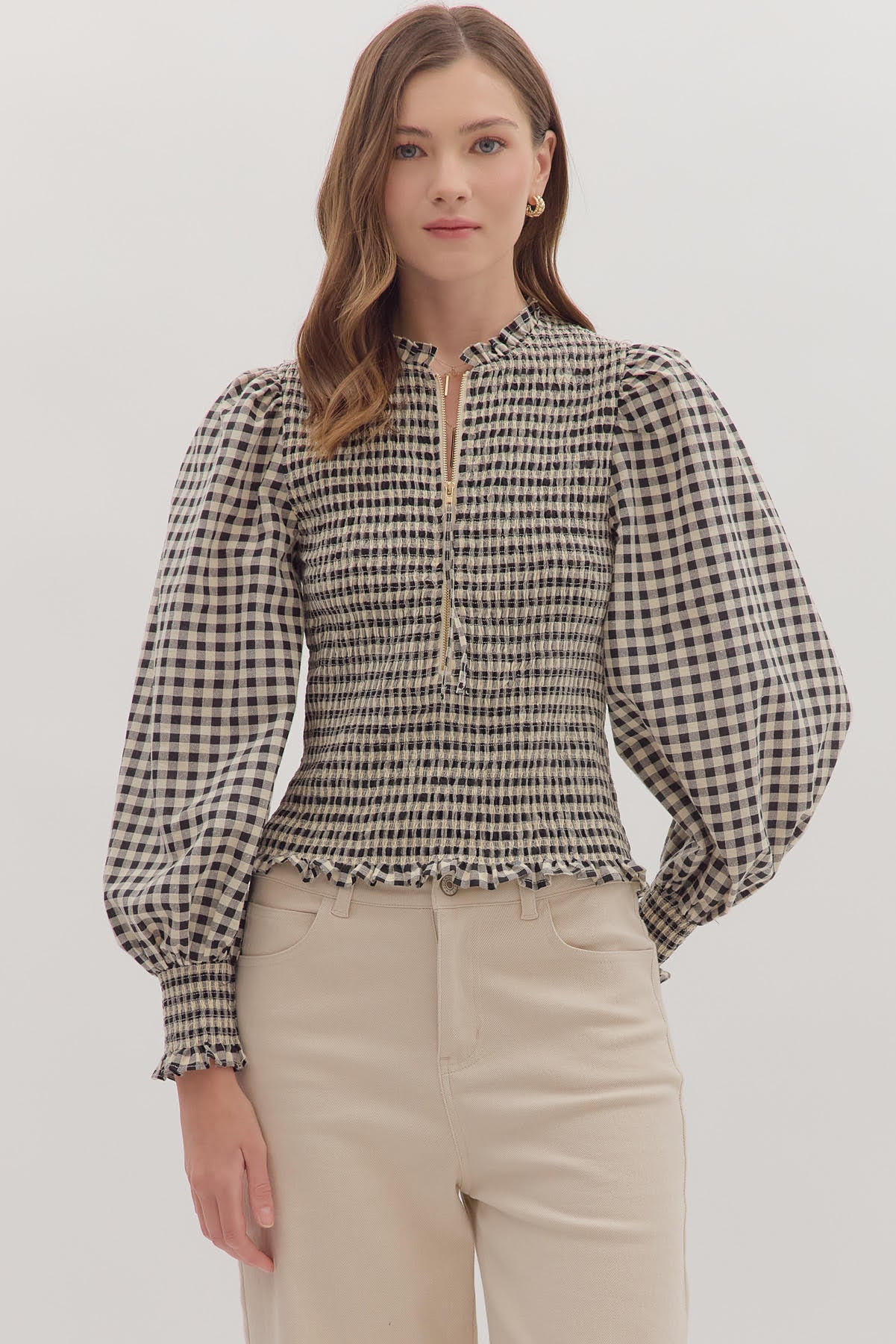 Gingham long puff sleeve top featuring smocked bodice and ruffle hem. Zip closure at front. Unlined. Woven. Non-sheer. Lightweight.