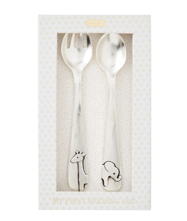 The My First Feeding Set is a memorable souvenir of baby's firsts. The set comes with a silverplate fork and spoon. The three-pronged fork features a giraffe icon. The spoon features a raised elephant icons. The set arrives in a box, for easy display and storage, the box measures 5 1/2".