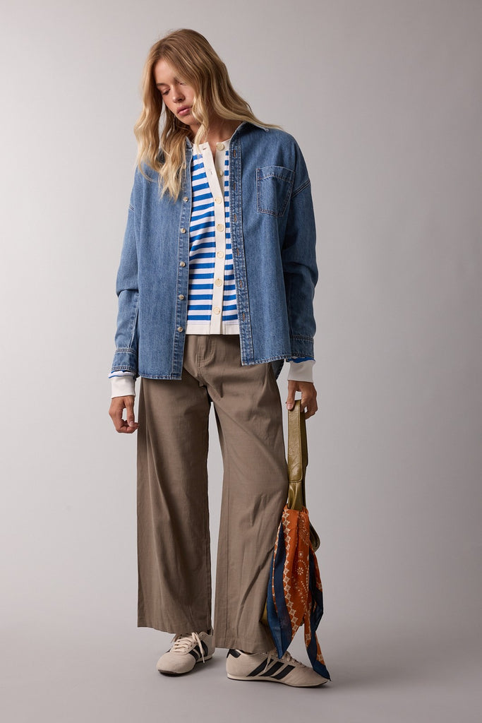 Button up denim shirt with a medium denim wash. Functional buttons, loose and comfortable for all day wear.