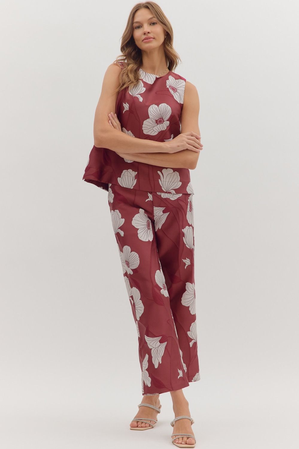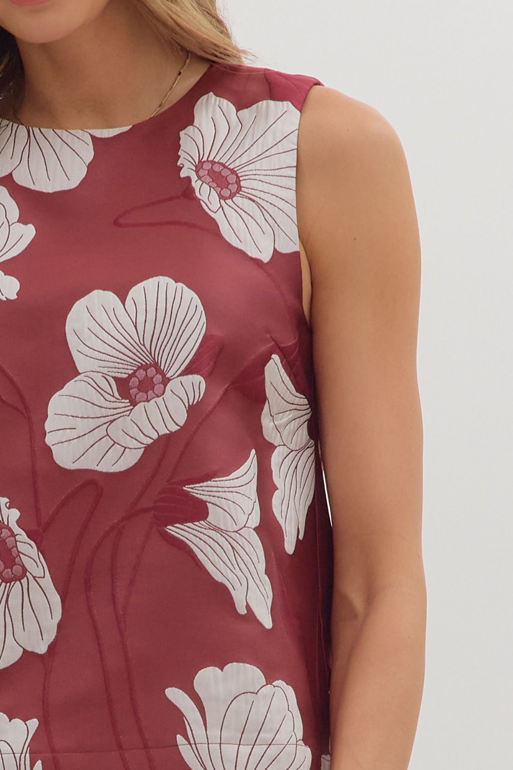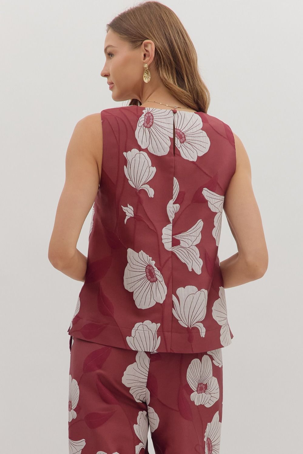 Floral print sleeveless top featuring back keyhole with button closure. Lined. Woven. Non-sheer. Lightweight.