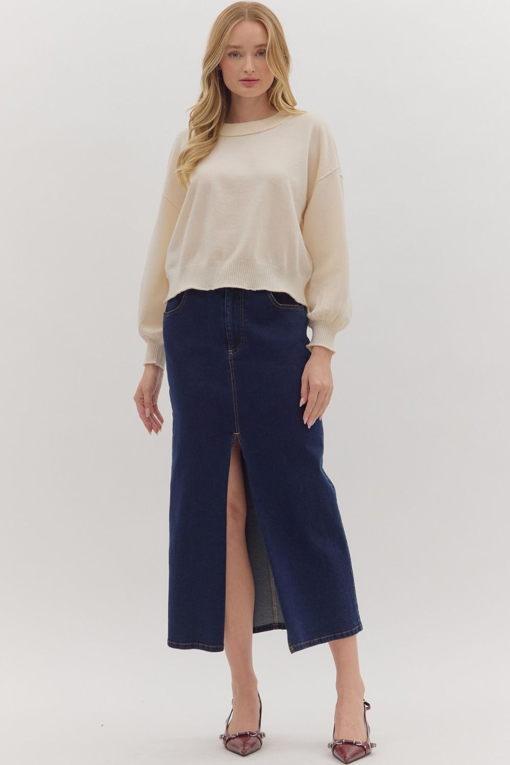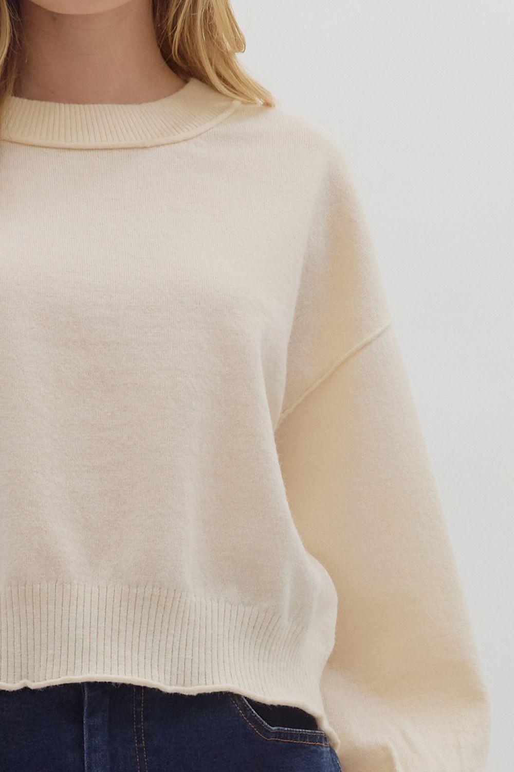 Solid long sleeve pullover sweater top featuring ribbed neck, cuffs, and hem. Unlined. Knit. Non-sheer. Medium weight.