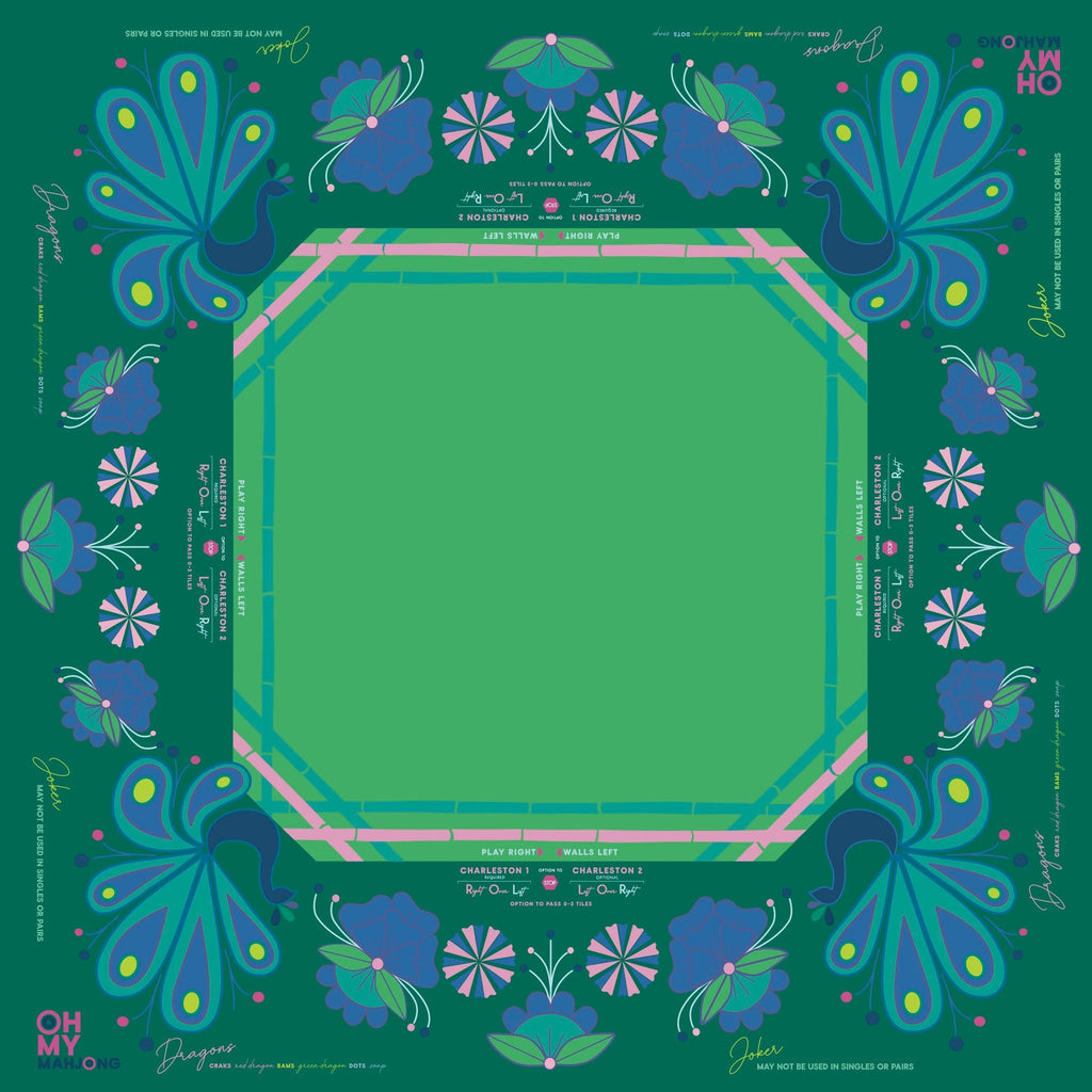 Introducing the Birdie Mahjong Mat! This vibrant mat features a stunning Birdie design and a non-slip surface to ensure your tiles stay put during even the most intense games. The Birdie Mahjong mat offers clear explanations directly on the mat, including the Charleston, suit and dragon pairings, wall direction, and the "no jokers in a pair" rule. Pairs perfectly with the Birdie Mahjong Tiles!