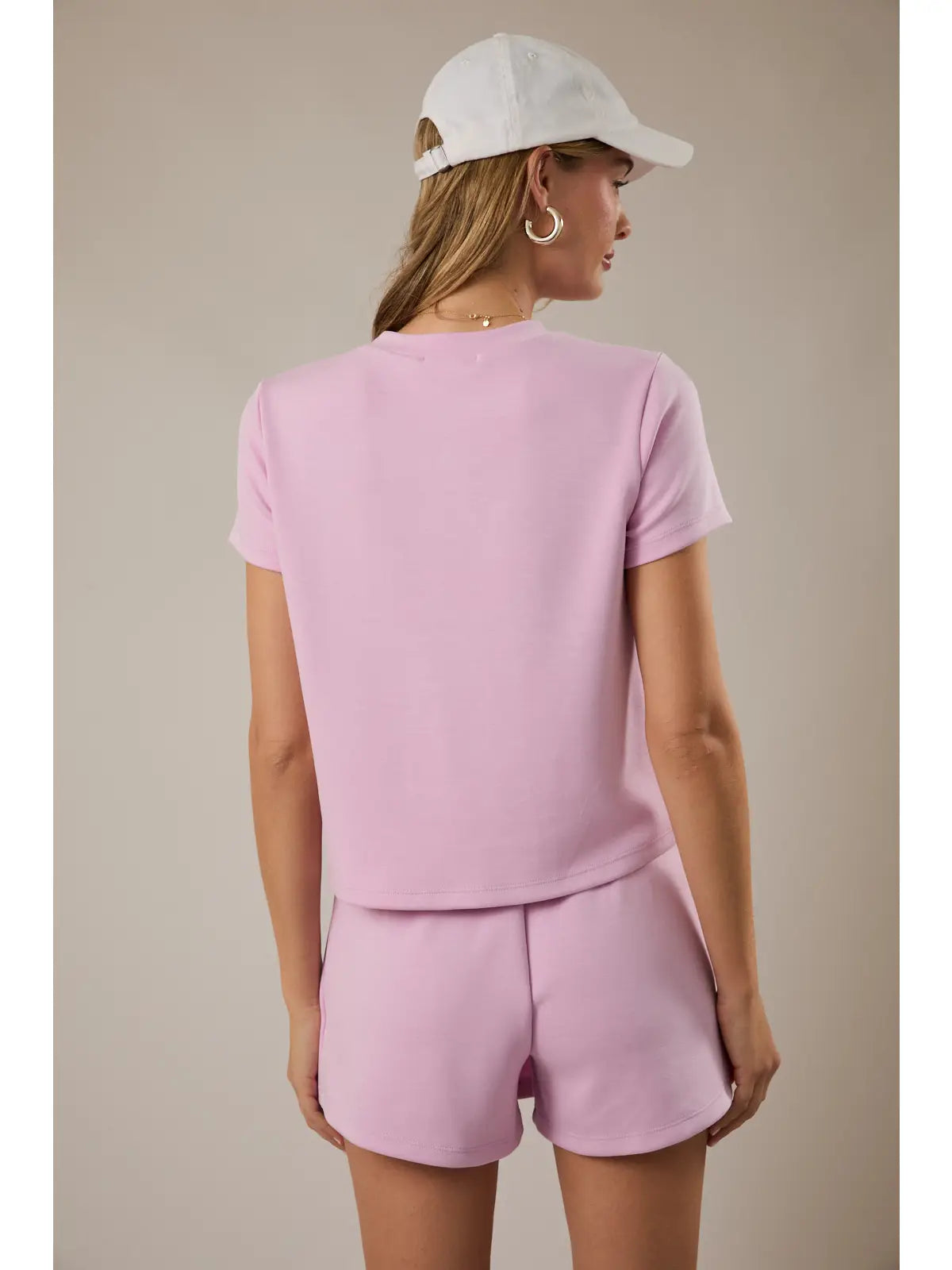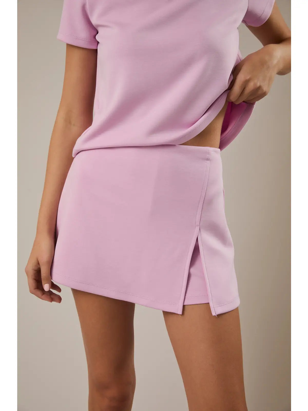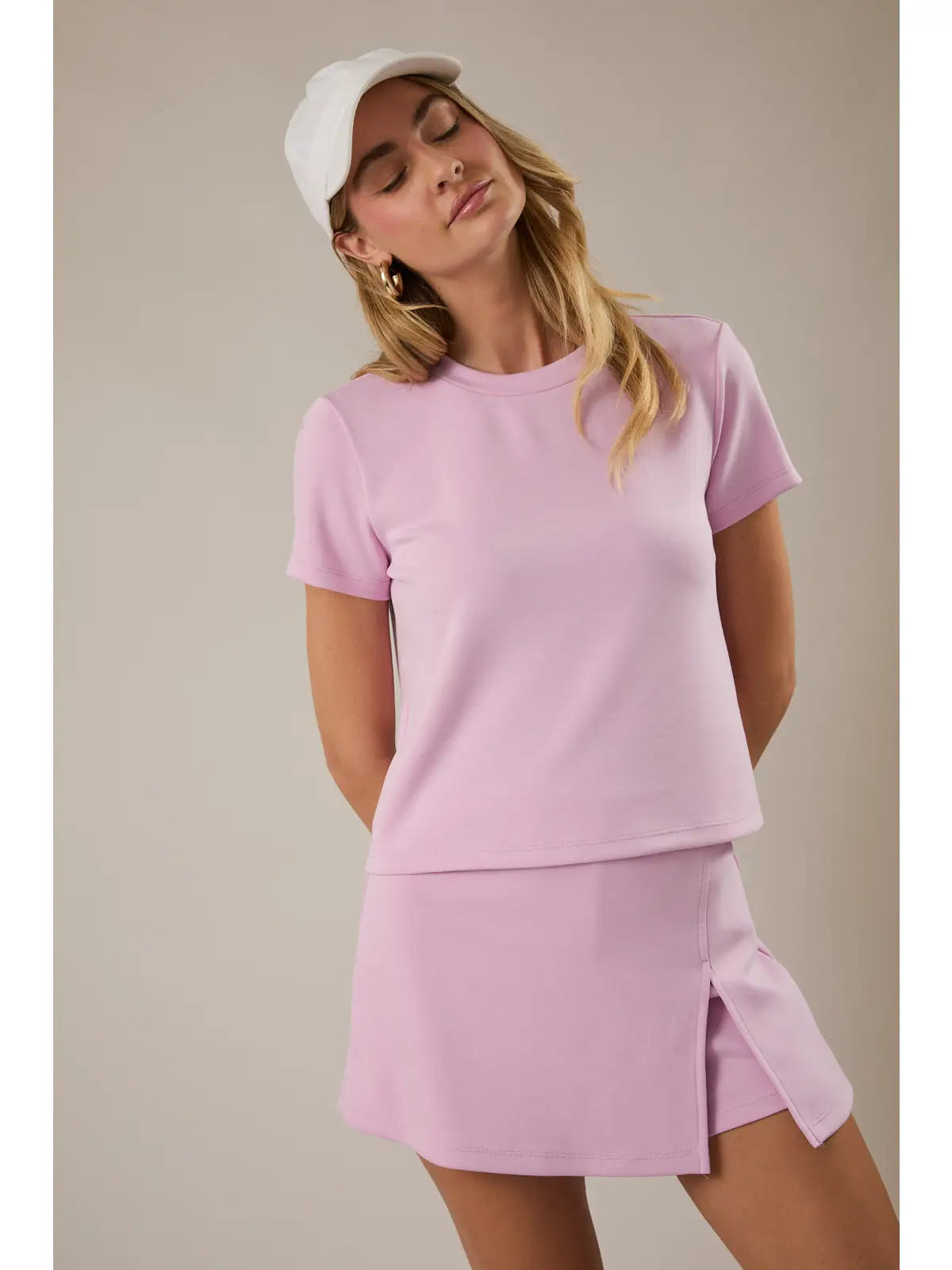 Includes a crew neck top and high waisted skort with a front slit and elastic details.