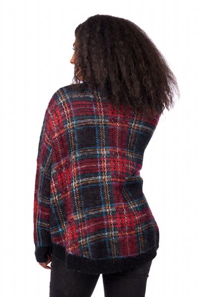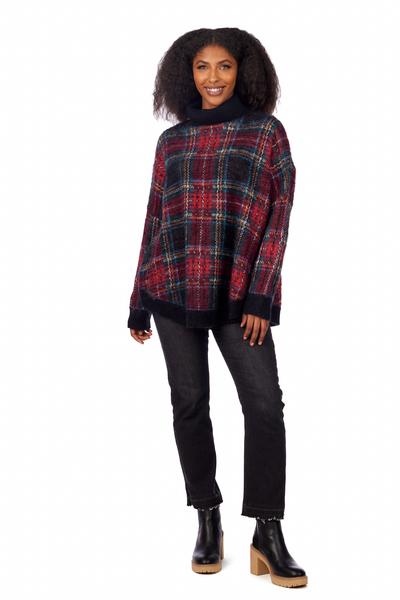 The Carla Sweater is a cozy and stylish addition to any wardrobe. Made from brushed knit fabric, this sweater is soft to the touch and perfect for keeping warm on chilly days. The dolman sleeves and rolled turtleneck add a trendy touch, while the plaid pattern and ribbed sleeve openings give it a classic and timeless look. The curved hem adds a flattering silhouette, and the one-size-fits-most design makes it a versatile option for any body type. With a length of approximately 28" from shoulder to hem, this sweater is perfect for pairing with leggings or jeans for a comfortable and chic outfit.