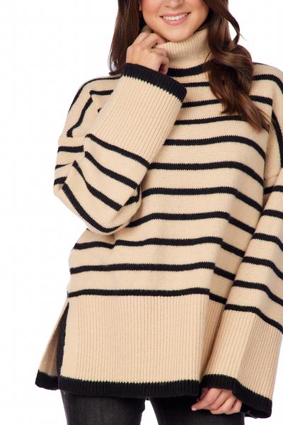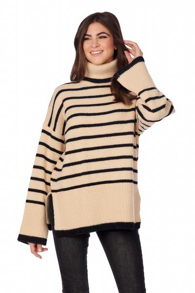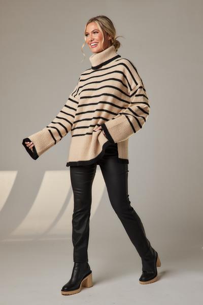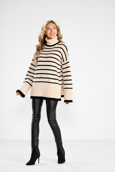 The Dunn Striped Sweater is a stylish and comfortable addition to your wardrobe. Made from a high-quality polyester knit, this sweater is designed to keep you warm and cozy. The striped pattern adds a touch of sophistication, while the ribbed sleeve openings provide a snug fit. The side vent hem adds a unique detail to the sweater, giving it a modern and trendy look. The rolled turtleneck adds an extra layer of warmth and style. With a length of approximately 27" from shoulder to hem on size small, this sweater is the perfect length for a flattering fit. Whether you're heading to the office or going out for a casual outing, the Dunn Striped Sweater is a versatile piece that can be dressed up or down.