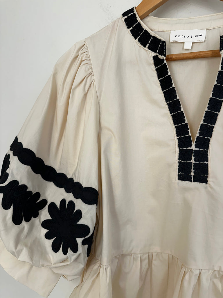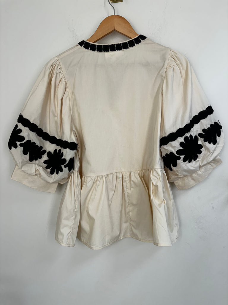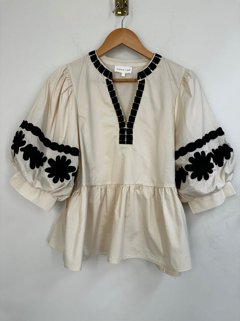 Solid ¾ bubble sleeve ruffle hem top featuring floral embroidery sleeves and neck. Unlined. Woven. Non-sheer. Lightweight.