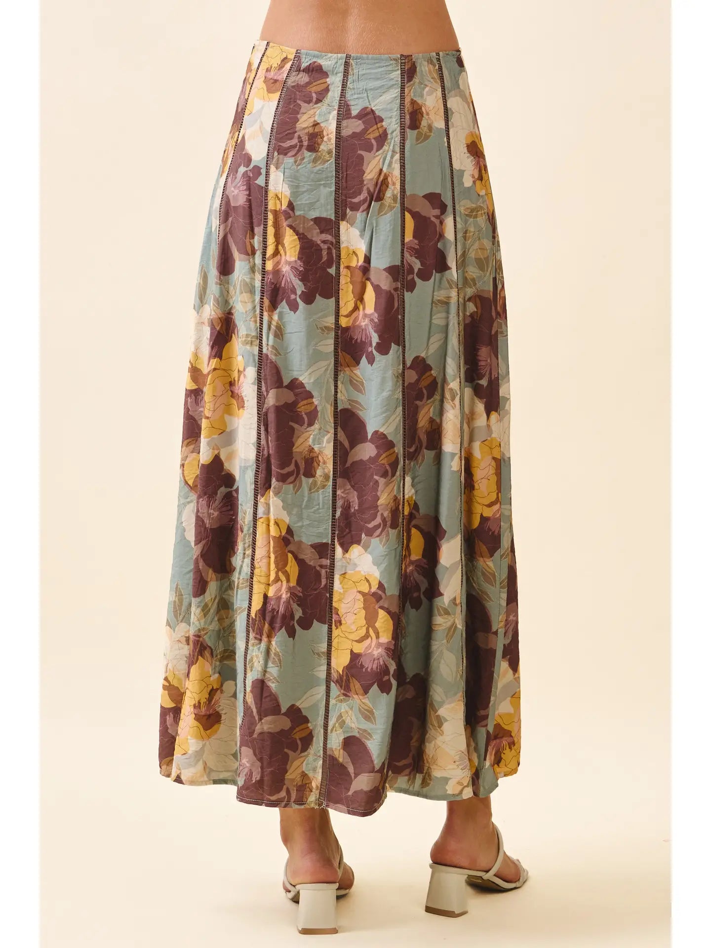 A floral-print midi skirt featuring paneled seaming with contrast topstitch details. Designed with a fitted waist, side zipper closure, and a flared hem. Pair with CT9664. Model Size + Fit: Model height: 5'11" Dress size: Small Bust: 31.5 Waist: 23.5 Hips: 35