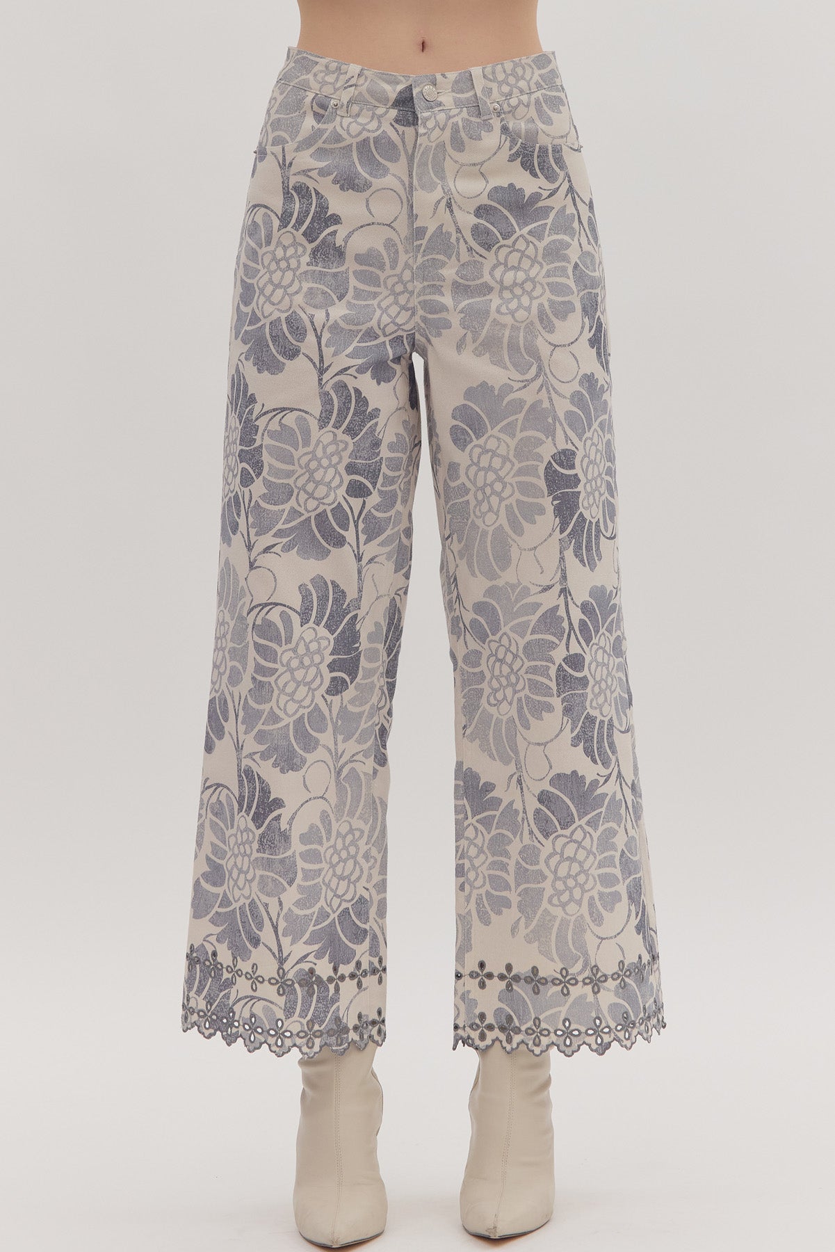 Floral print straight leg pants featuring scallop eyelet hem. Zip-fly button closure at front. Unlined. Woven. Non-sheer. Lightweight.