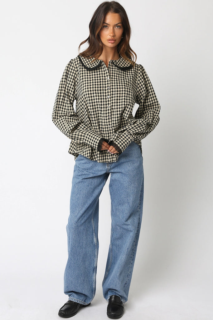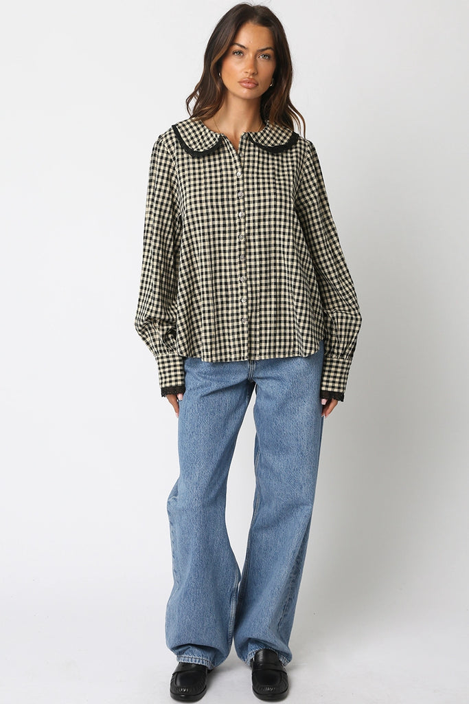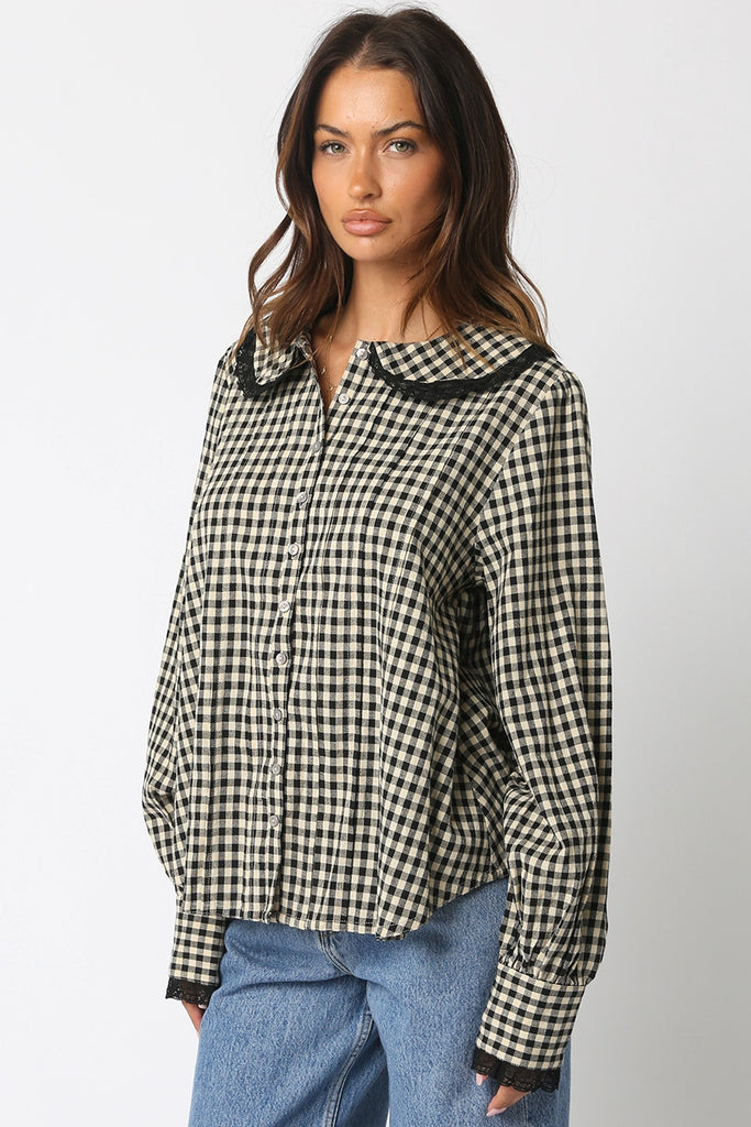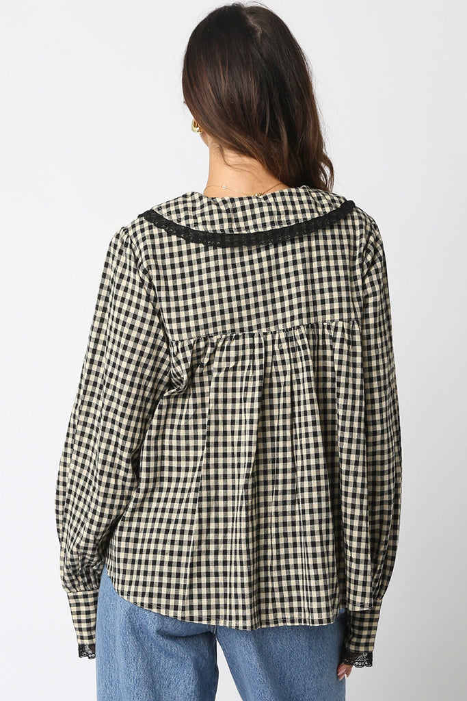 Lace Trimmed Gingham Button Down {Black}
