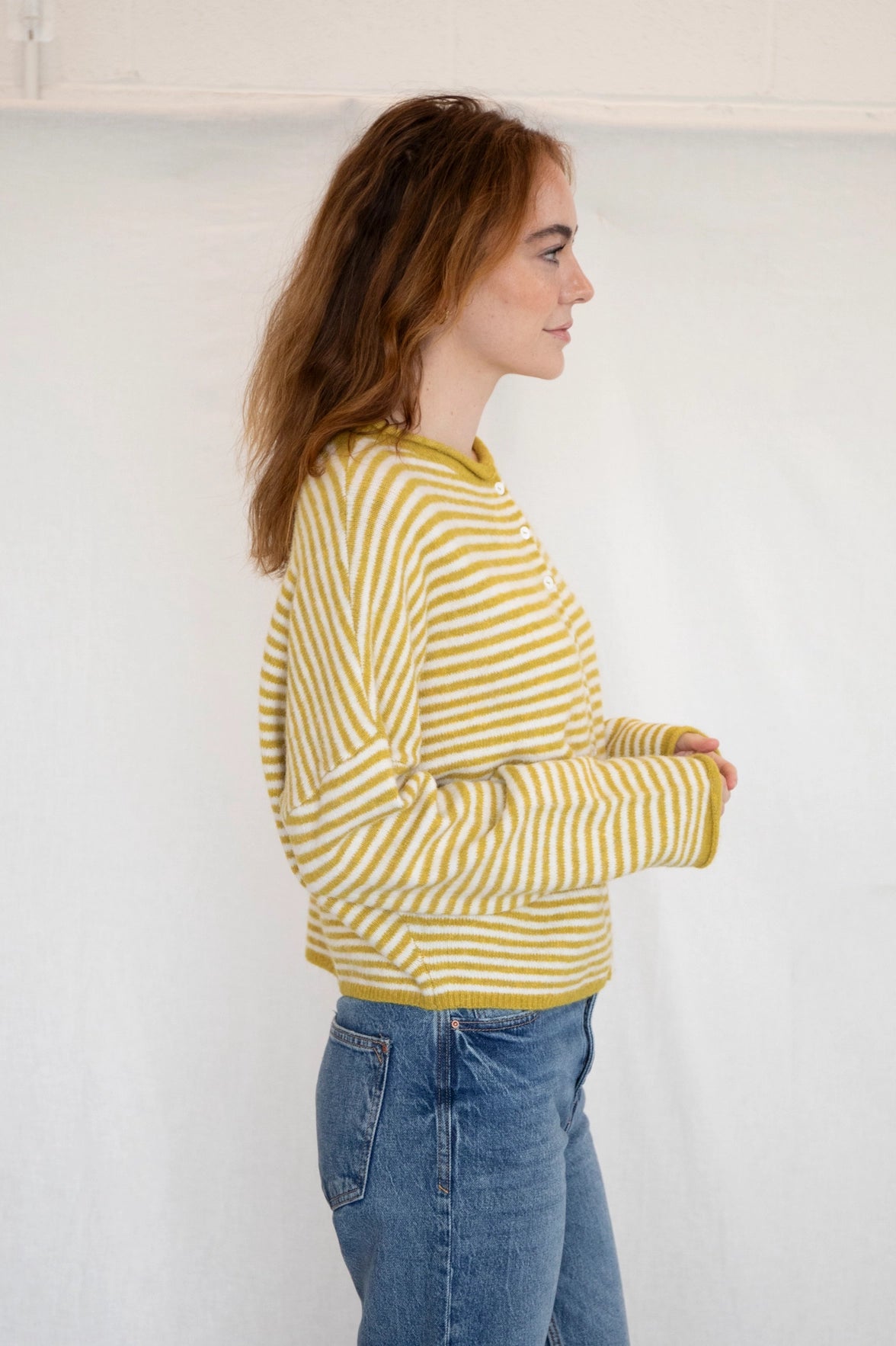 Soft and cozy cardigan in mini stripes - lightweight and rolled edge finish on the sleeves and collar.