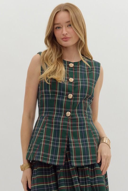 Woven sleeveless vest with gold accented buttons and a plaid pattern.