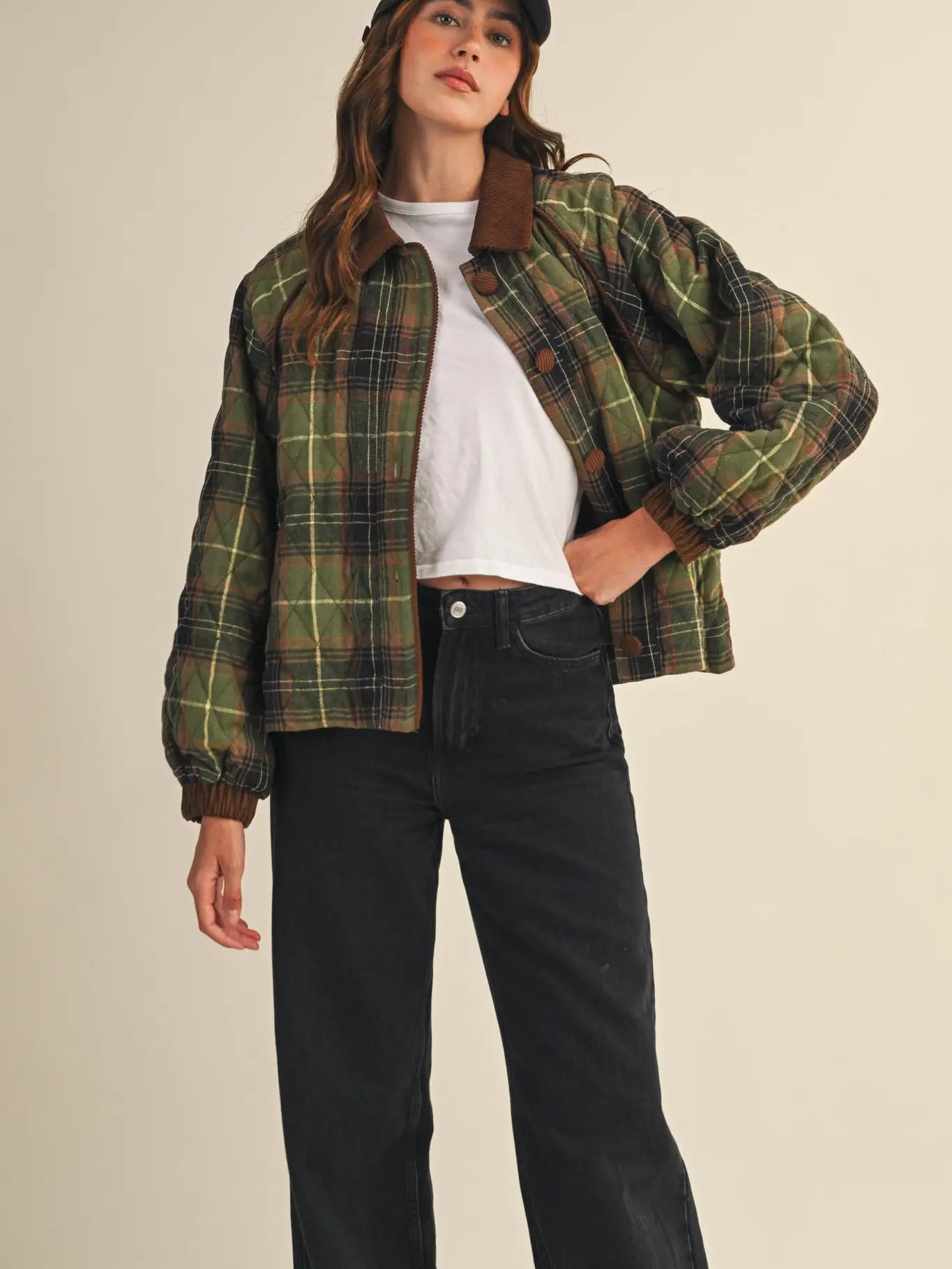 Plaid quilted jacket with contrast corduroy detail + Corduroy collared neckline + Corduroy covered buttons