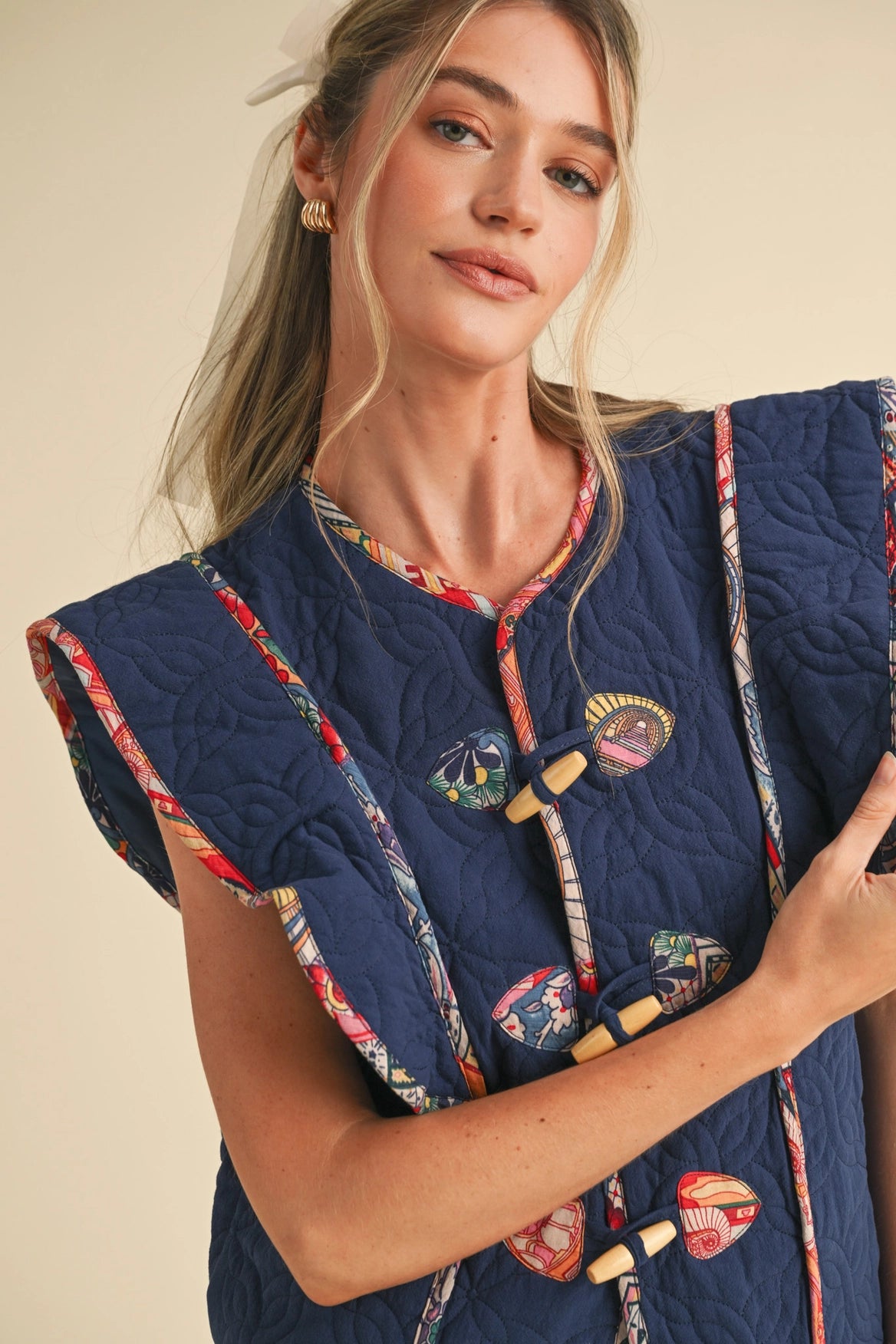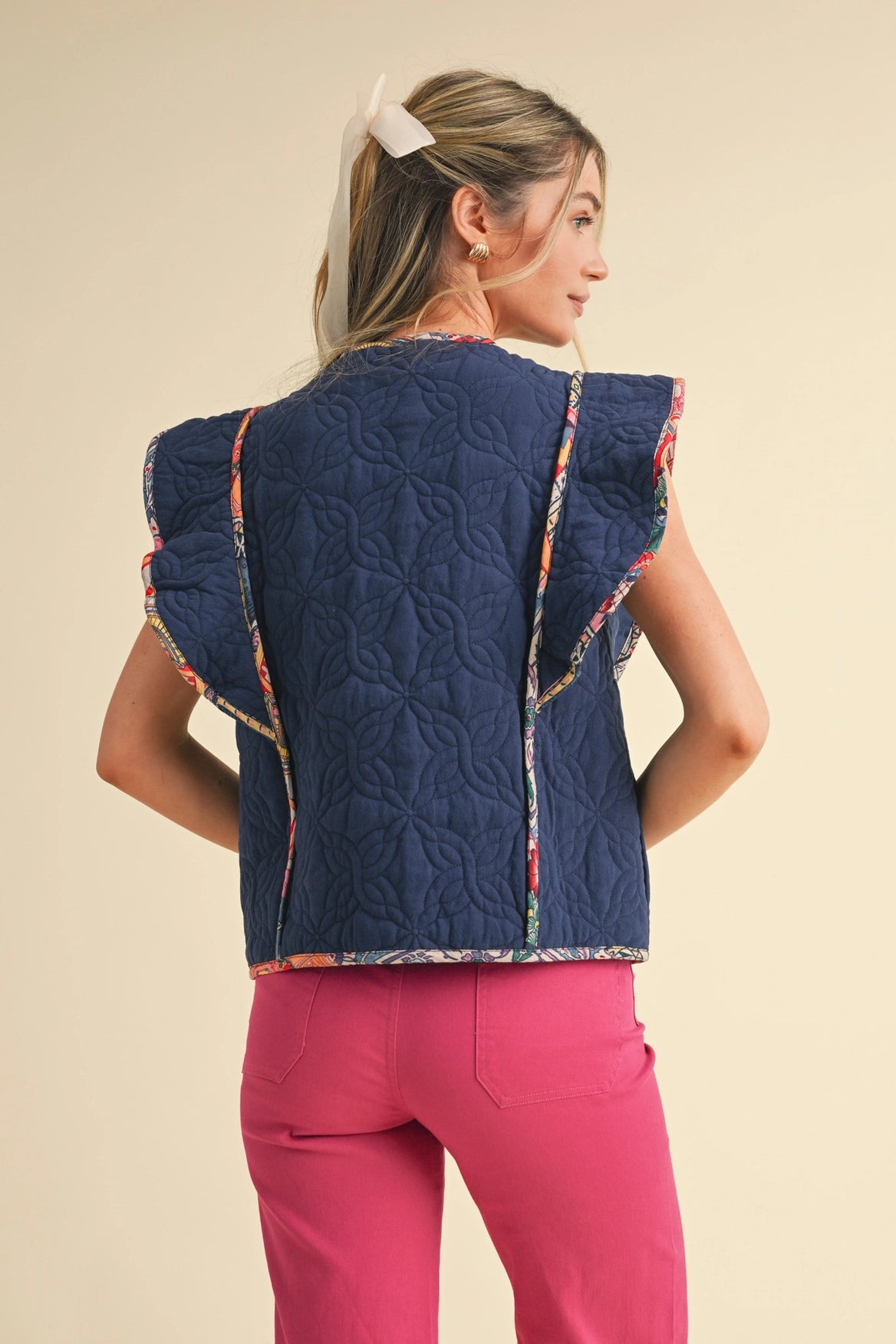 Stand out as a style icon in this quilted print binding vest! Lightweight and sturdy quilted puffer shapes this chic vest that features contrast print binding throughout and has wood toggle closure, ruffled flutter sleeves, and side pockets. Add this versatile statement piece to any outfit for an instant upgraded look!