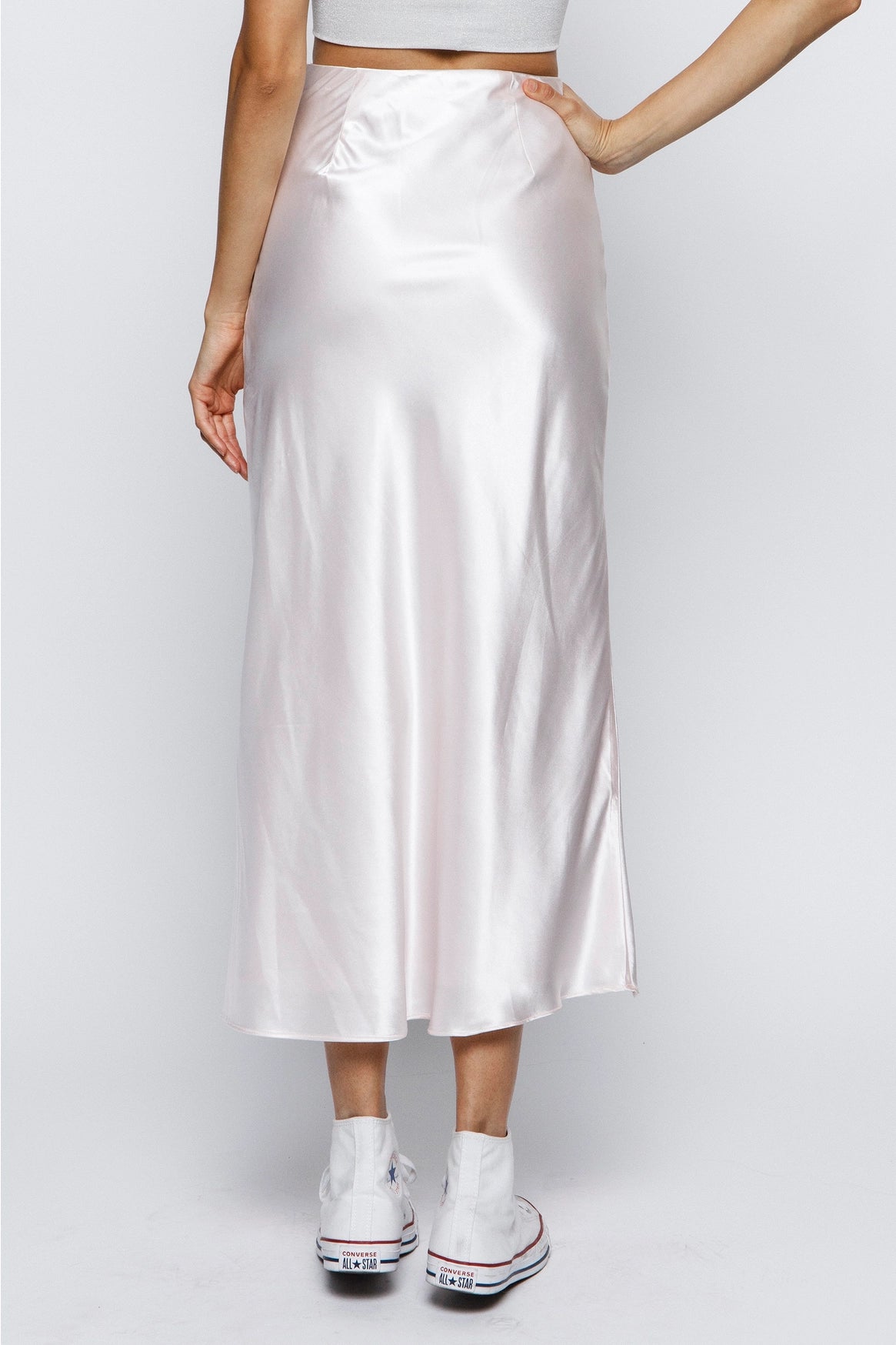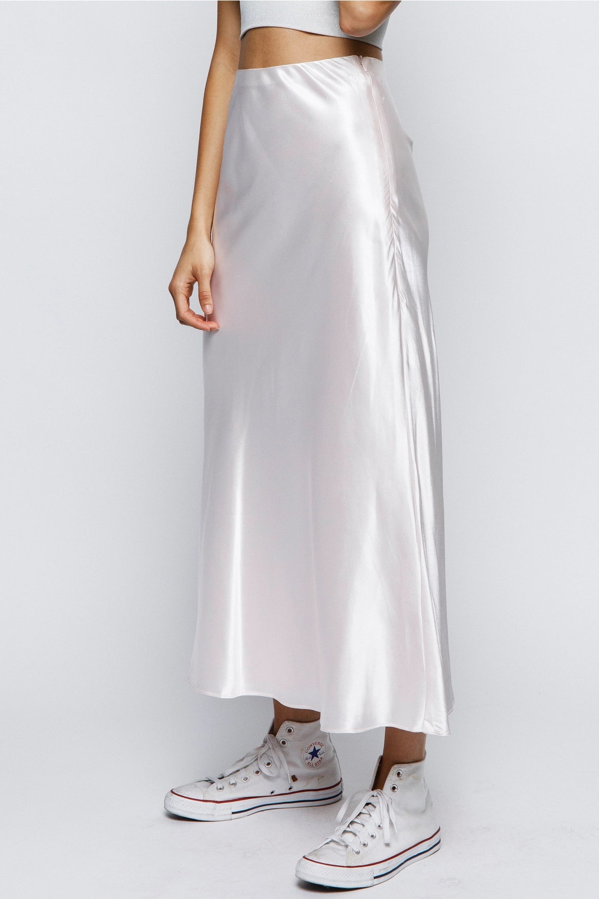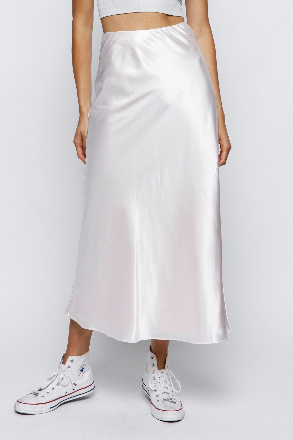 Monochromatic satin midi skirt. It exhibits a high waist, A-line flared midi, and a side invisible zipper.