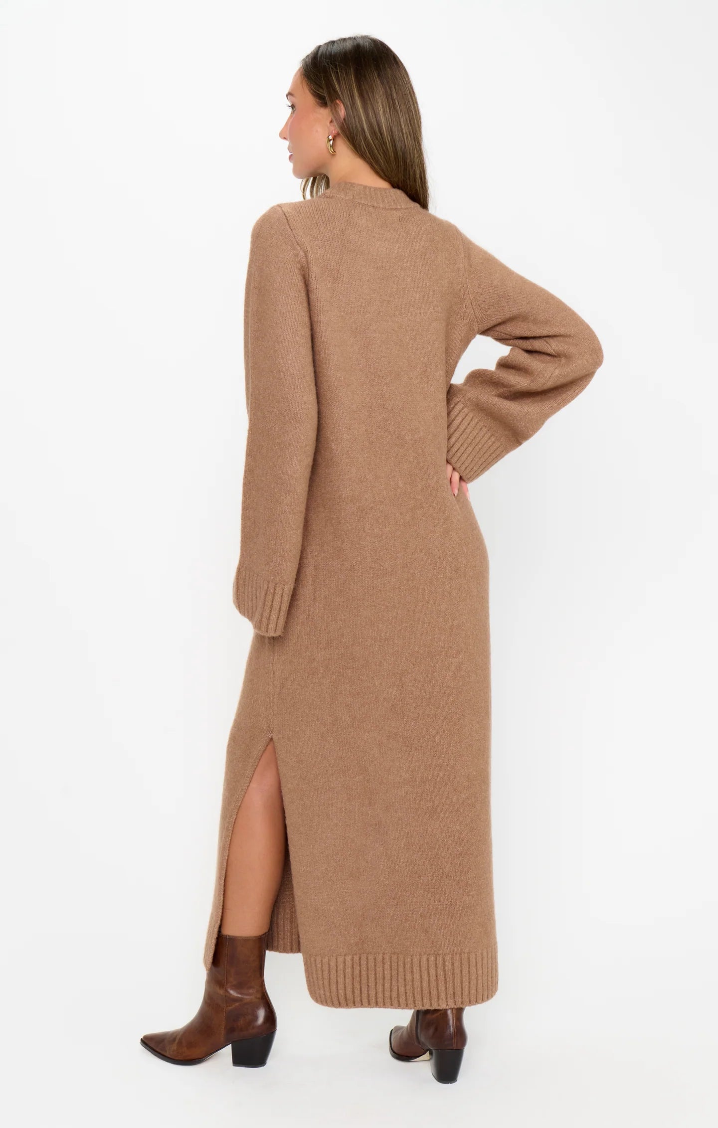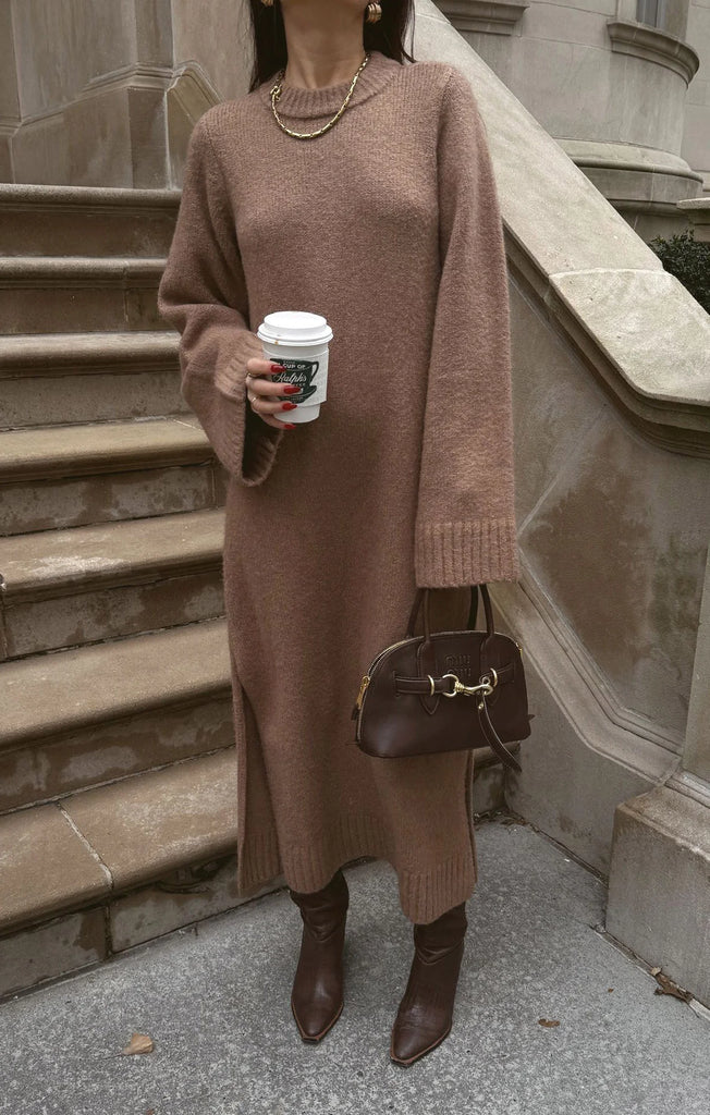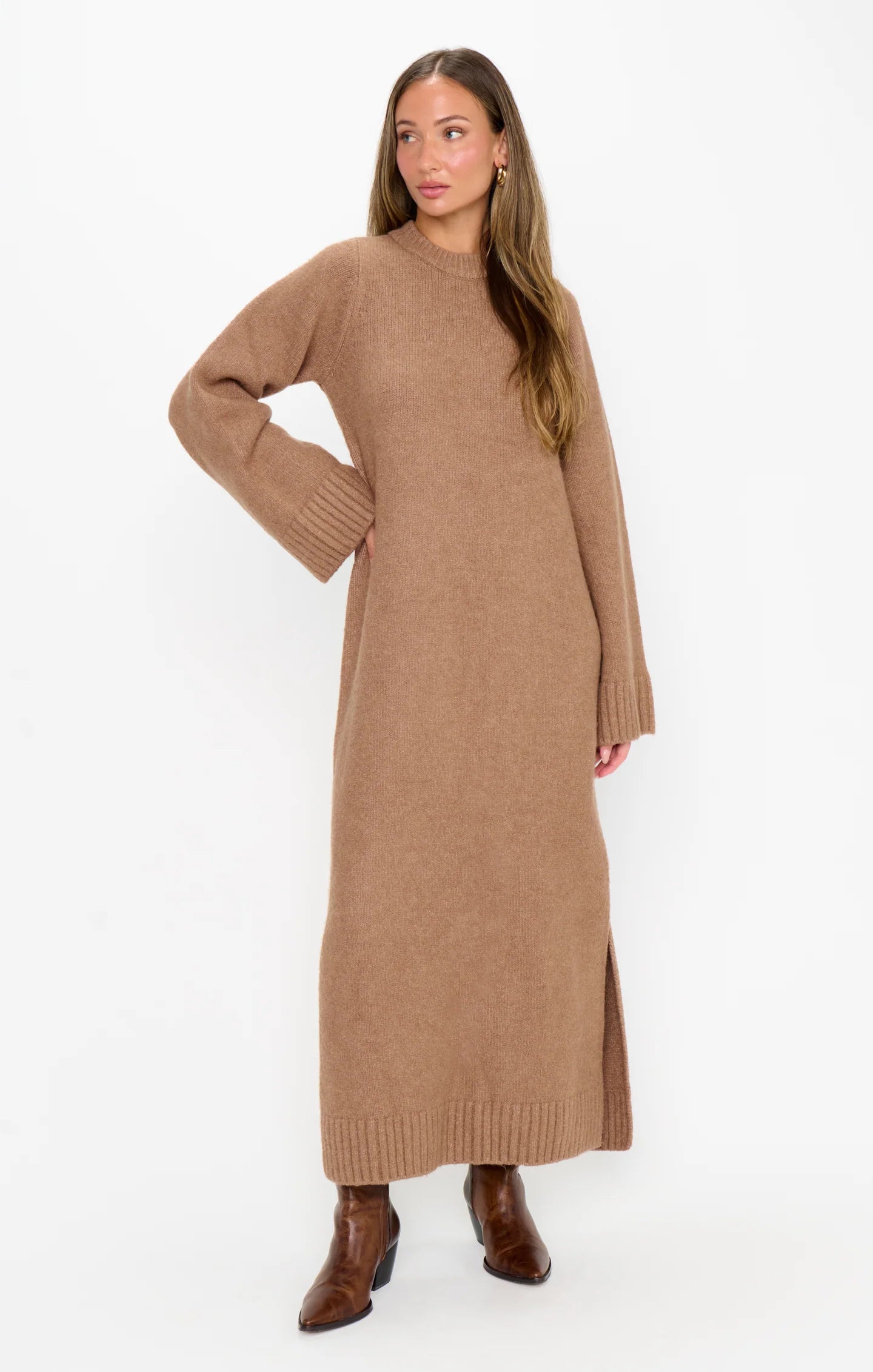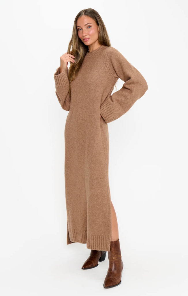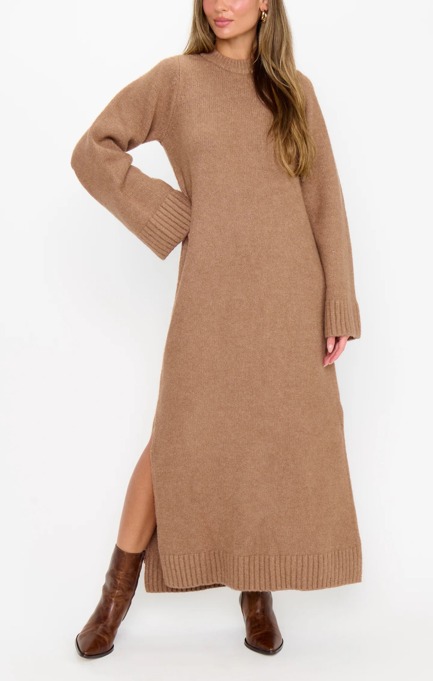 Easy, effortless, and made for crisp fall days! The Lorraine Dress is crafted in a cozy maple brown knit with side slits at the hem, striking the perfect balance between flattering and comfy. Belt it to define your waist or wear it loose for that effortlessly chic, cozy vibe.