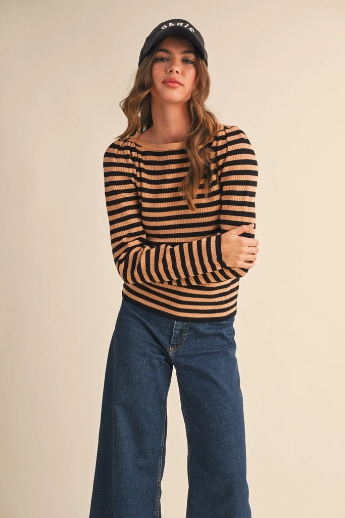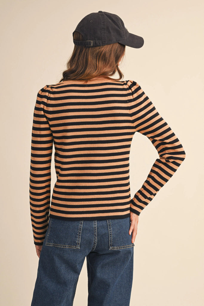 Striped boat neck sweater + Boat neckline + Gathered puff shoulders + Long sleeves + Waist length fit + Fitted bodice