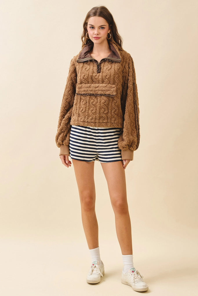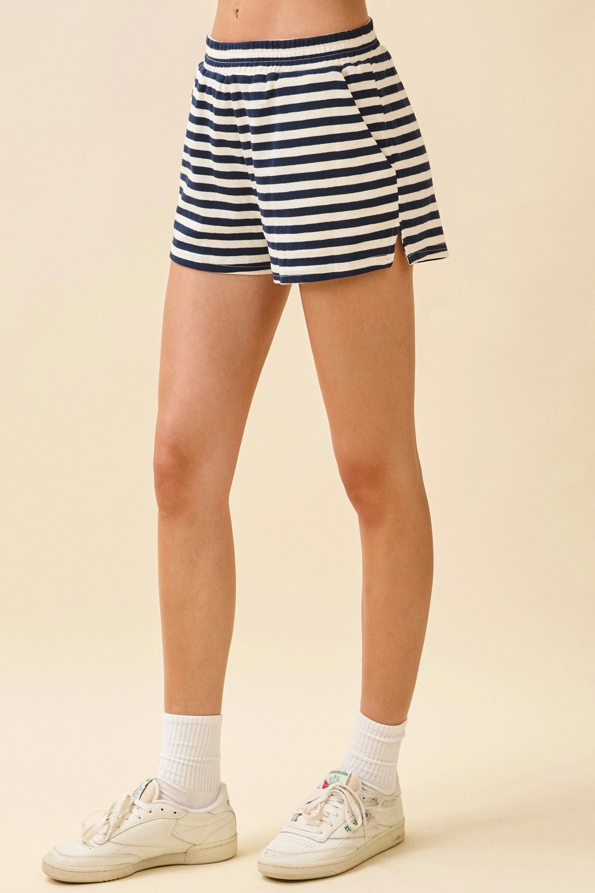 A pair of striped knit shorts featuring an elasticized waistband and side slits for ease of movement. Designed with a relaxed fit for casual comfort. Model Size + Fit: Model height: 5'11" Dress size: Small Bust: 31.5 Waist: 23.5 Hips: 35