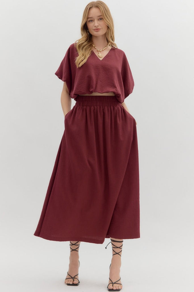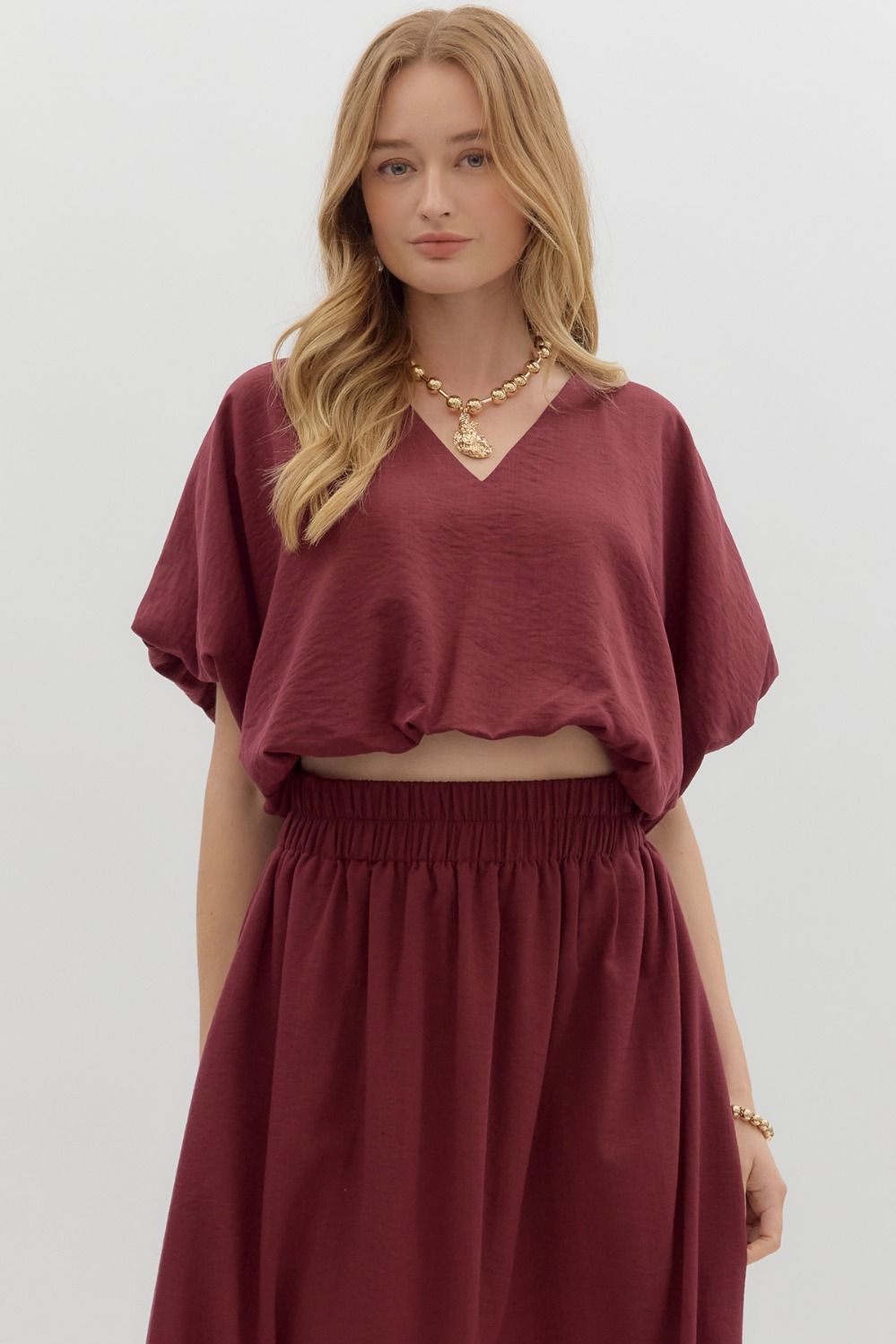 Solid V-neck short dolman sleeve crop bubble top. Single button closure at back. Lined. Woven. Non-sheer. Lightweight.