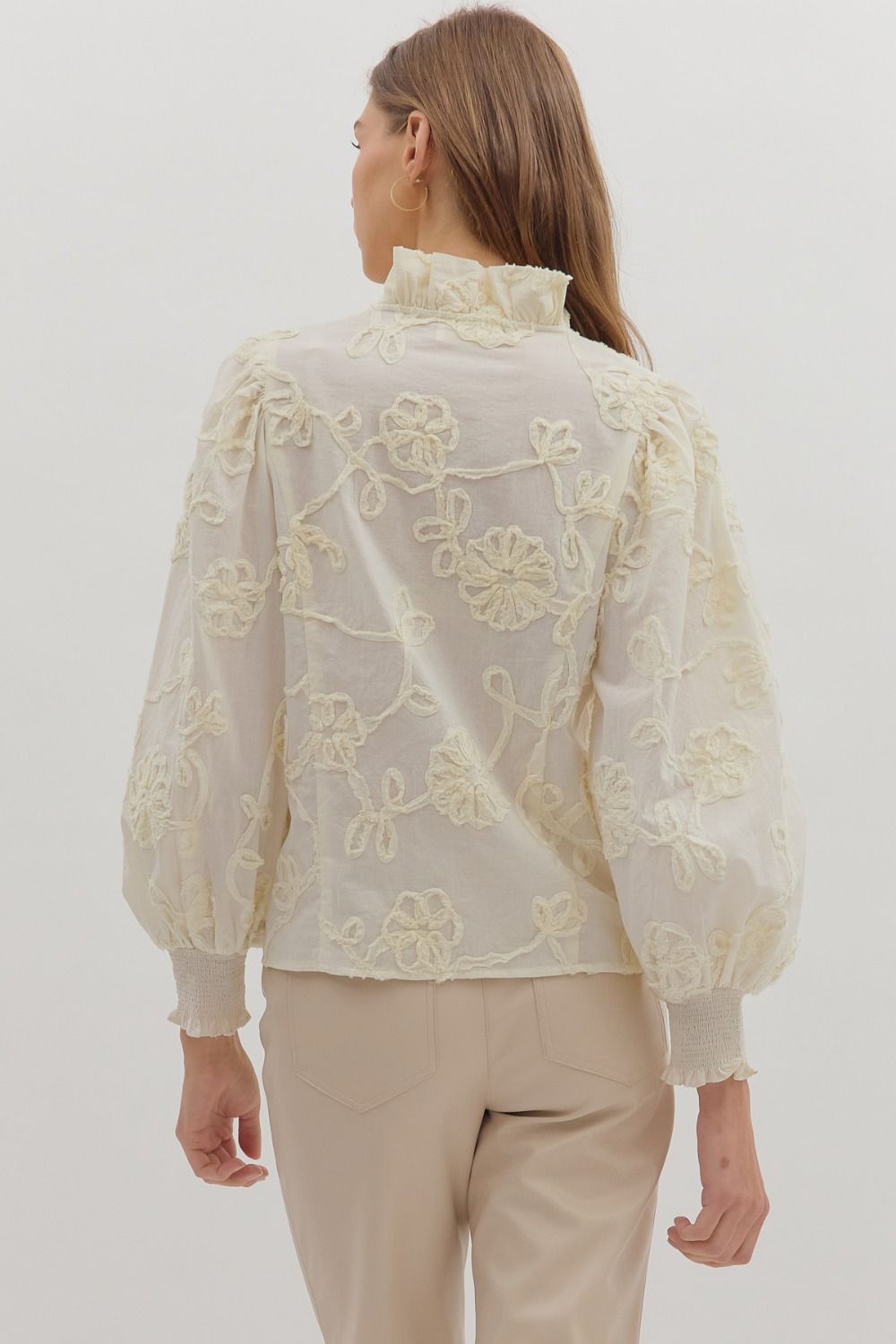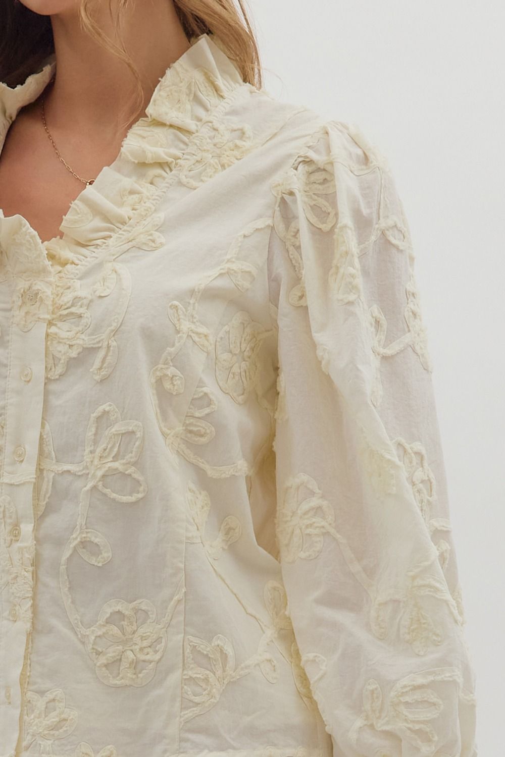 Floral applique embroidered long puff sleeve top with smocked ruffle cuffs, featuring a ruffled V-neck and button-up front. Lined. Woven. Non-sheer. Lightweight.