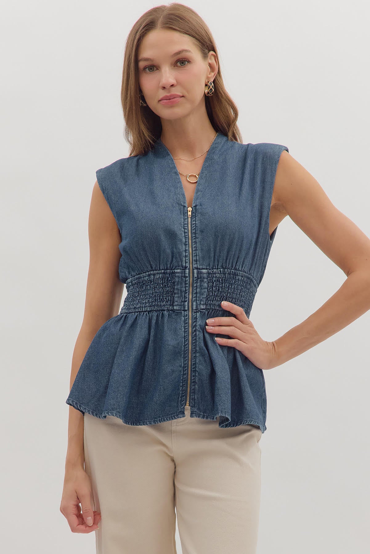 Solid sleeveless denim peplum top featuring wide smocked waist and zipper closure at front. Unlined. Woven. Non-sheer. Lightweight.