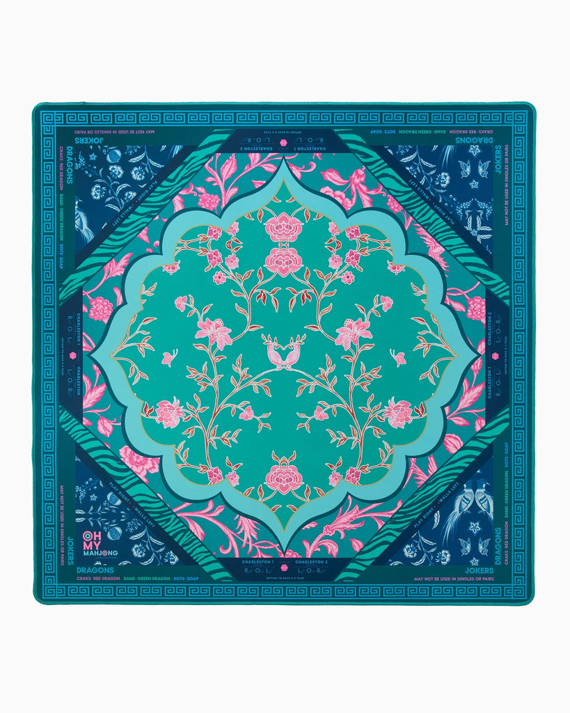 Introducing the Esme Mat — a vibrant, artfully chic addition to your Mahjong setup, designed for those with a love for playful elegance and globally inspired design. Drenched in fresh tones of green, blue, and pink, this mat brings together painterly florals, bold zebra accents, and a classic cane border for a look that’s both spirited and sophisticated. It’s cosmopolitan yet inviting — the perfect marriage of Palm Beach whimsy and timeless heritage charm.